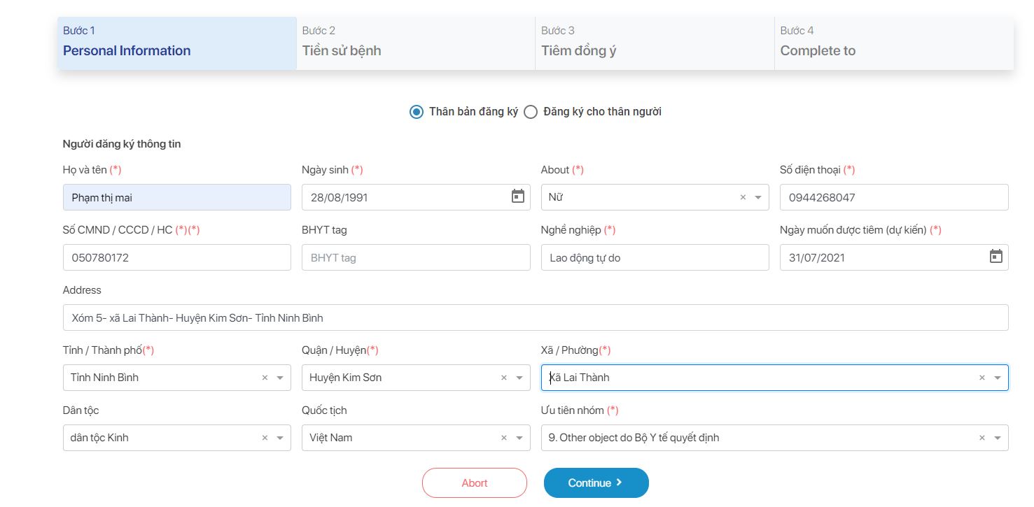 Theo đó, bạn nhấp vào đường link https://tiemchungcovid19.gov.vn/portal/register-person. Tại đây đã có form sẵn, bạn chỉ cần điền đầy đủ các thông tin như hệ thống yêu cầu: