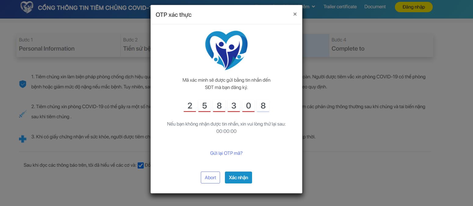 Sau khi tích vào ô đồng ý, hệ thống sẽ gửi mã OTP đến điện thoại của bạn. Người dân chỉ cần nhập số OTP rồi nhấn “Xác nhận”.