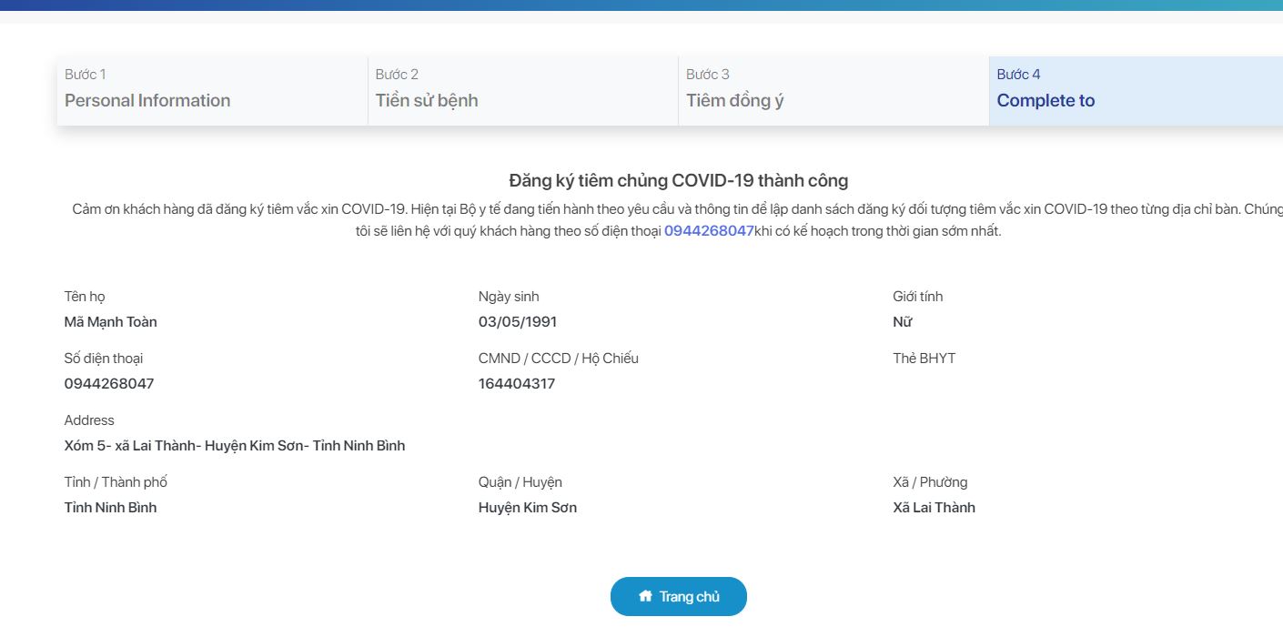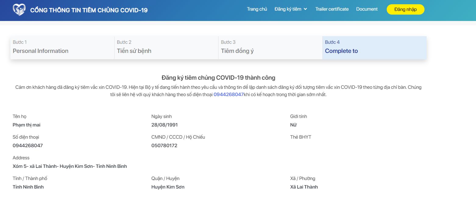 Ở bước 5, hệ thống sẽ hiển thị đầy đủ các thông tin bạn đã khai báo. Đồng thời, website xác nhận bạn đã đăng ký tiêm vaccine Covid-19 thành công.