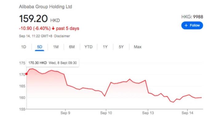 Theo thông tin từ tờ CNN, sau khi Financial Times cho biết Bắc Kinh đang có kế hoạch chia tách Alipay(một ứng dụng thanh toán của Ant Group), giá cổ phiếu của Alibaba lại tiếp tục sụt giảm vào thứ 2(13/9).