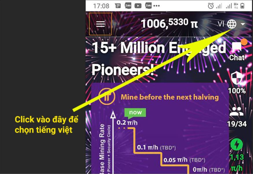 - Bước 1: Kích hoạt vào vòng tròn bảo mật Pi Network và chọn tiếng Việt.