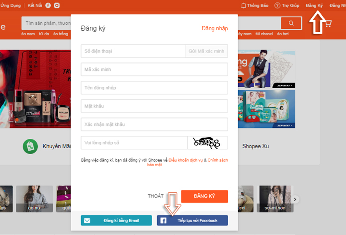 - Bước 1: Bạn vào website chính thức của Shopee https://shopee.vn. Sau đó, nhấn vào mục “Đăng ký” ở phía trên bên phải. Khung thông tin hiện ra, bạn hãy điền đầy đủ chính xác rồi ấn khung Đăng ký. Hoặc có thể lựa chọn đăng ký nhanh bằng email/ facebook(nếu có).
